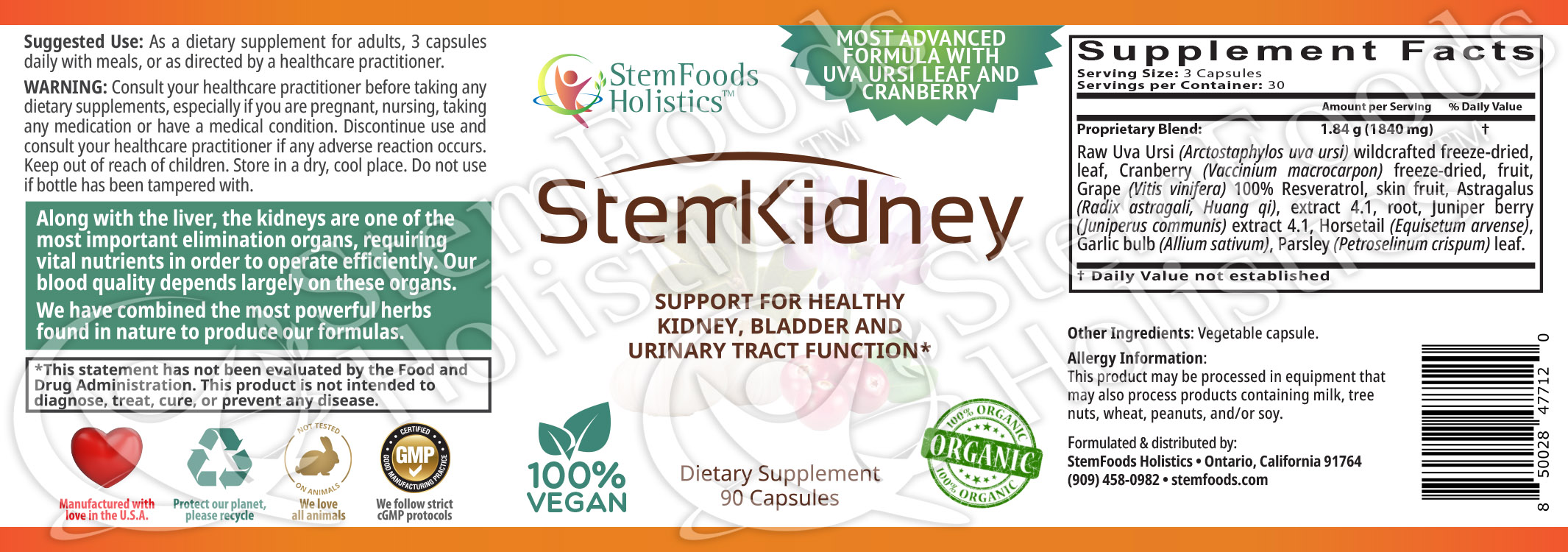 StemKidney is especially formulated to support kidney and urinary tract health. The ingredients found in StemKidney are well known for their natural properties promoting healthy urinary tract and kidney function. We only use top quality ingredients in all our supplements, which are formulated for maximum benefits.